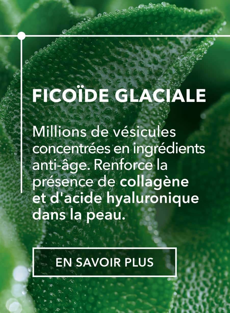La Ficoïde Glaciale brevetée de La Gacilly contient des millions de vésicules concentrées en ingrédients anti-âge. Appelée aussi "Plante de vie", elle est capable de conserver toute sa fraicheur, vitalité et jeunesse en toutes circonstances. Nous avons mis au point un extrait à l'efficacité brevetée pour transposer ses pouvoirs anti-rides exceptionnels à la peau.